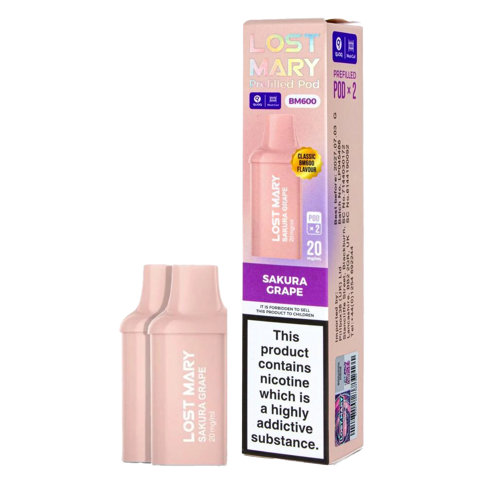 Lost Mary BM600 prefilled pods combine 20mg nic salt with a QUAQ mesh coil, delivering a sophisticated blend of floral sakura and dark grape for a unique MTL vape.