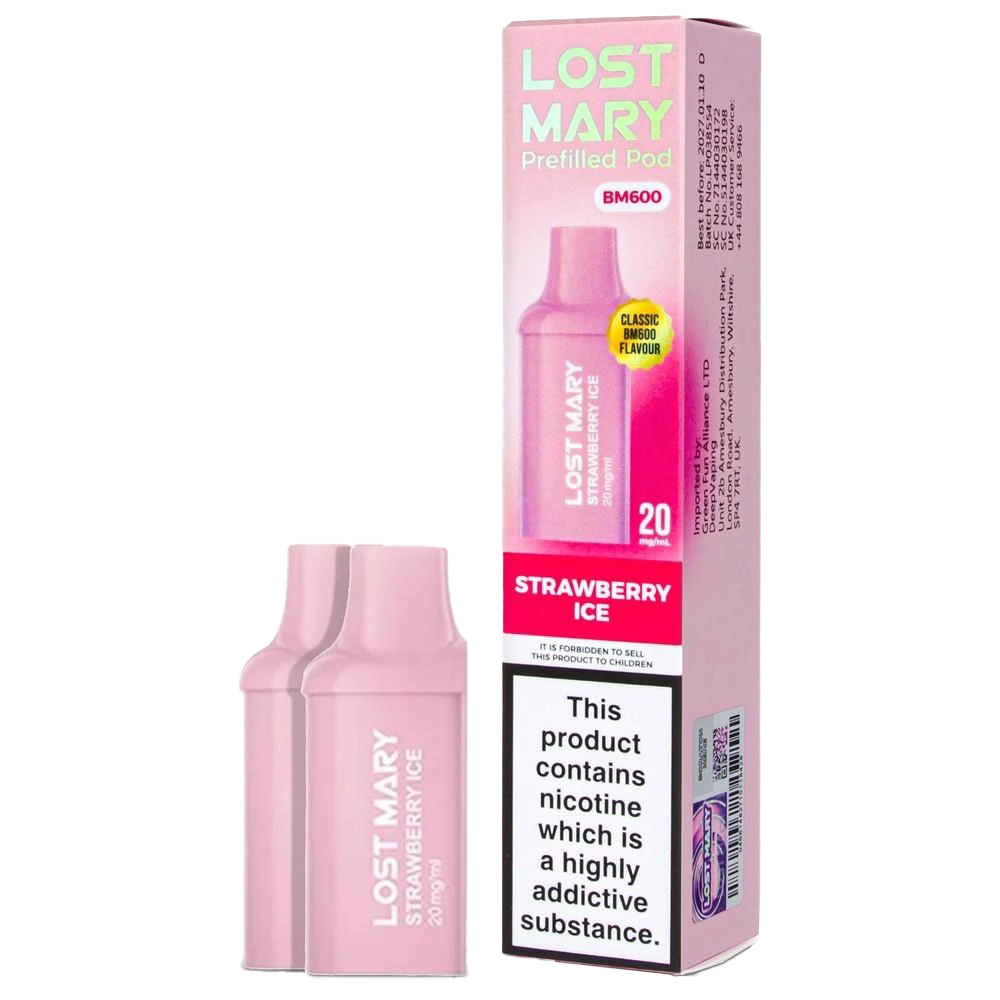 Strawberry Ice combines ripe strawberry with menthol cooling. These prefilled pods suit the Lost Mary BM600 Pod Kit and pack the disposable's classic fruit-menthol combo into swappable form. The strawberry is sweet and full, backed by moderate ice that refreshes without overwhelming. This is one of the most popular profiles for good reason. Compatible with BM600 devices only.