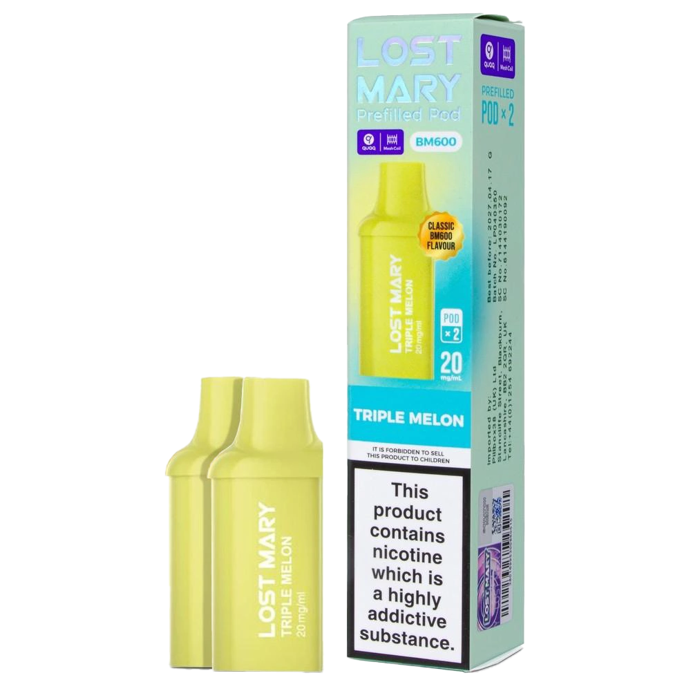 Lost Mary BM600 replacement pods feature 2ml of 20mg nic salt and a QUAQ mesh coil, delivering a sophisticated watermelon, honeydew, and muskmelon blend for MTL vaping.