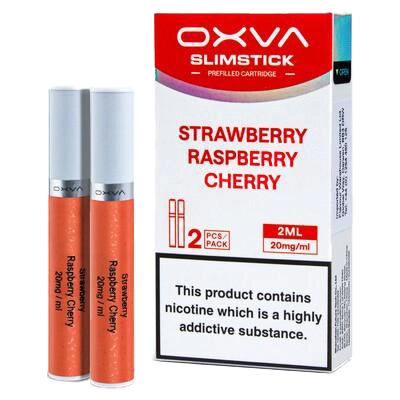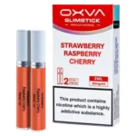 Oxva Slim Stick Strawberry Raspberry Cherry prefilled pods feature a 1.2Ω mesh coil and 20mg nic salt, providing 600 puffs of a complex, triple-berry MTL blend.