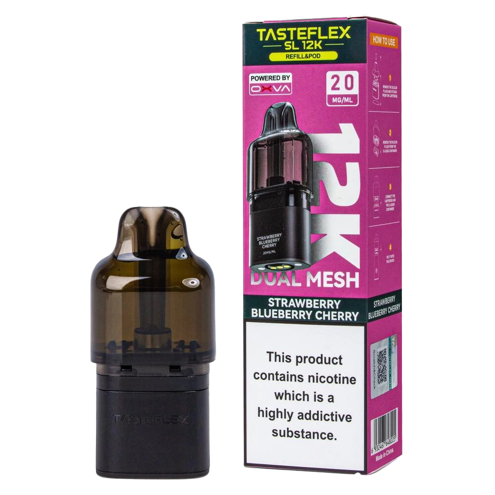 Oxva Tasteflex SL 12K Strawberry Blueberry Cherry pods feature a 12ml auto-refill system and dual mesh coils, delivering up to 12,000 puffs of a complex, triple-berry MTL blend.