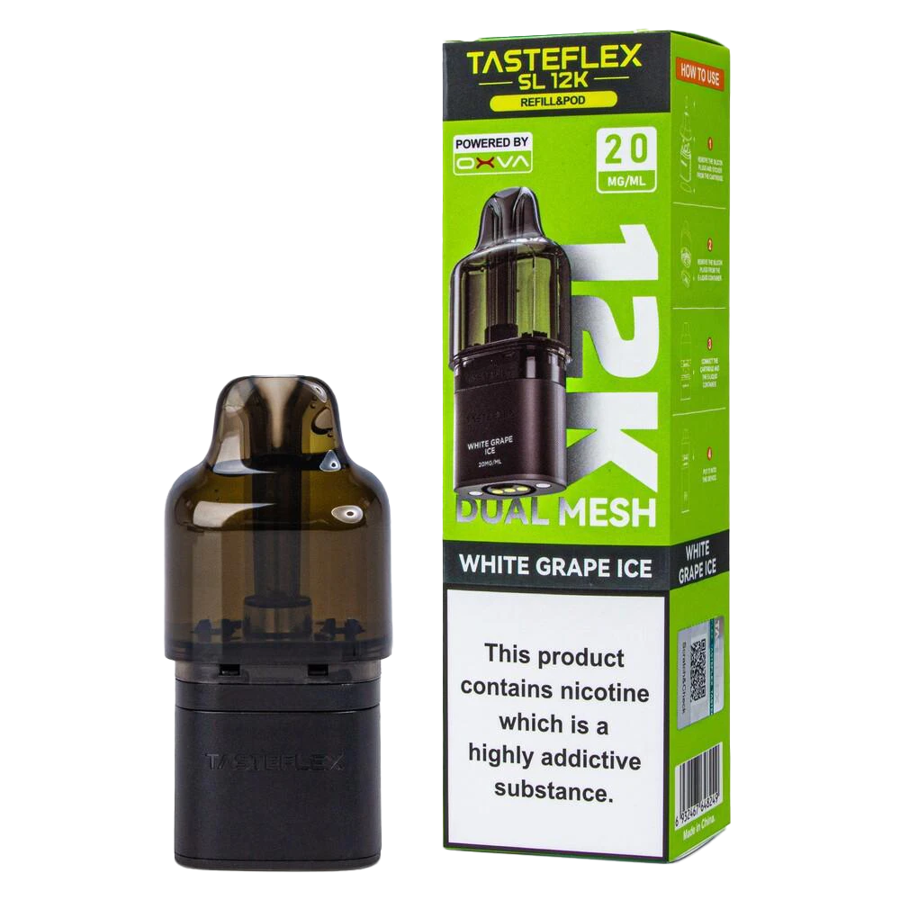 Oxva Tasteflex SL 12K White Grape Ice pods offer 12,000 puffs of sophisticated floral grape and crisp menthol, featuring a 12ml auto-refill system and dual mesh coils.
