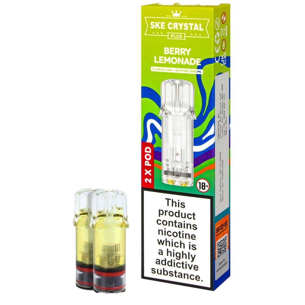 The SKE Crystal Plus Berry Lemonade pods attempt a summer-drink blend of mixed berries and lemonade fizz. These prefilled pods fit Crystal Plus and 600 Pro pod kits, delivering 2ml of 20mg nic salt through a 1.1Ω mesh coil for MTL vaping. The berries provide fruity sweetness while lemonade adds tang and effervescence. Ice content is moderate, enhancing the refreshing character. Around 600 puffs of drink-inspired vaping that works better in concept than execution—the berries feel generic.