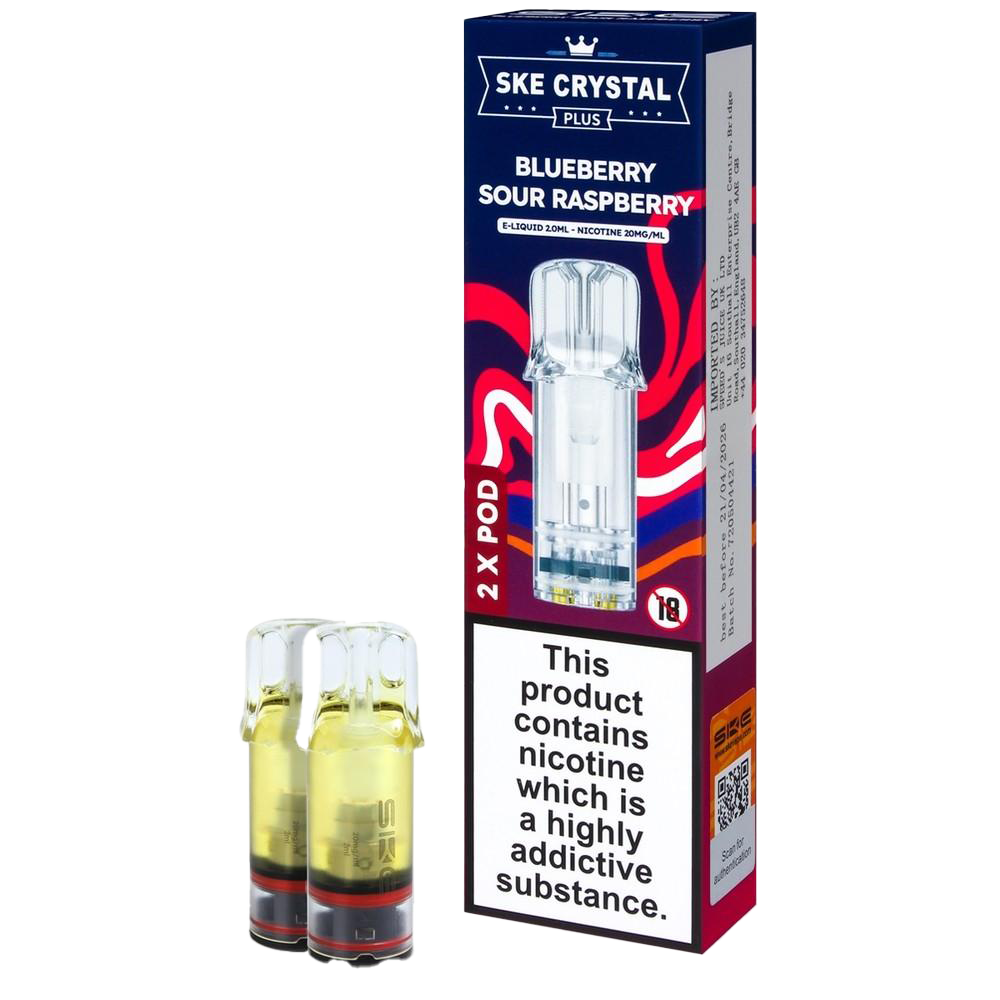 The SKE Crystal Plus Blueberry Sour Raspberry pods crank up the tartness more than any other pod in the range, hitting that sour candy profile some vapers crave. Compatible with Crystal Plus and 600 Pro devices, these 2ml prefilled pods use 20mg nic salt and a 1.1Ω mesh coil to balance blueberry sweetness against raspberry sourness. The result is polarizing—if you love sour sweets, this nails it; if you prefer smooth fruit, you'll find it abrasive. Around 600 puffs per pod with aggressive flavour that never lets up.