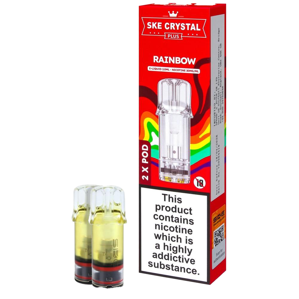 The SKE Crystal Plus Rainbow pods (also called Fruit Medley) throw multiple fruits into the mix without clear definition—think pick-and-mix sweets rather than a curated fruit salad. These prefilled pods work with Crystal Plus and 600 Pro kits, delivering 2ml of 20mg nic salt through a 1.1Ω mesh coil. The flavour is deliberately vague: sweet, fruity, with raspberry as the only clearly identifiable component. If you're after specific fruit accuracy, look elsewhere; if you want uncomplicated candy-fruit sweetness, this delivers. Around 600 puffs with consistent sugary taste throughout.