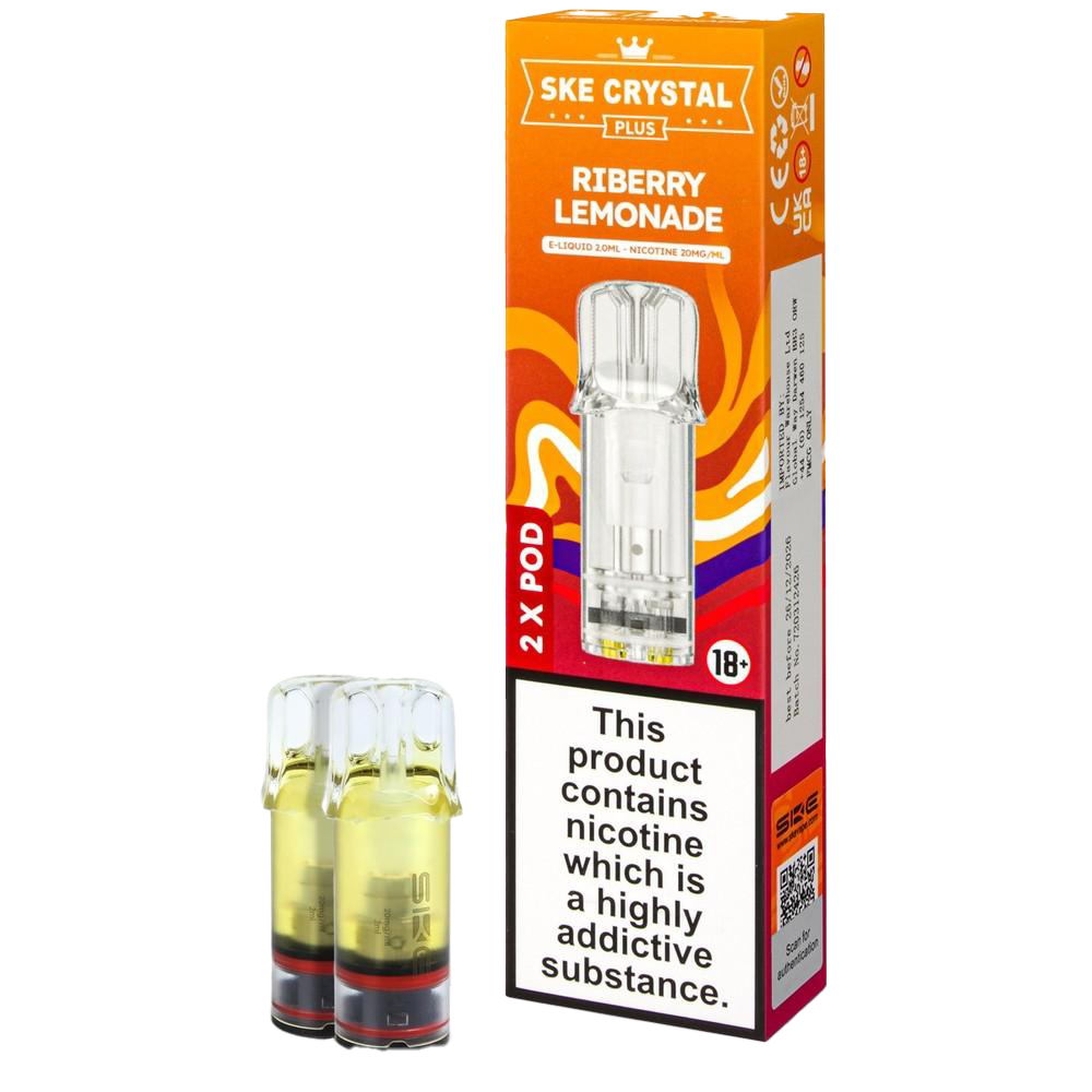 The SKE Crystal Plus Riberry Lemonade pods blend raspberry and strawberry with lemonade fizz—though the execution feels muddled. Compatible with Crystal Plus and 600 Pro devices, these 2ml prefilled pods use 20mg nic salt and a 1.1Ω mesh coil to deliver a vape that's more lemonade than berry. The 'riberry' (raspberry-strawberry) element is understated to the point of barely registering. What you get is sweet, fizzy lemonade with a pink tint rather than a fruit-forward profile. Around 600 puffs of lemonade dominance.