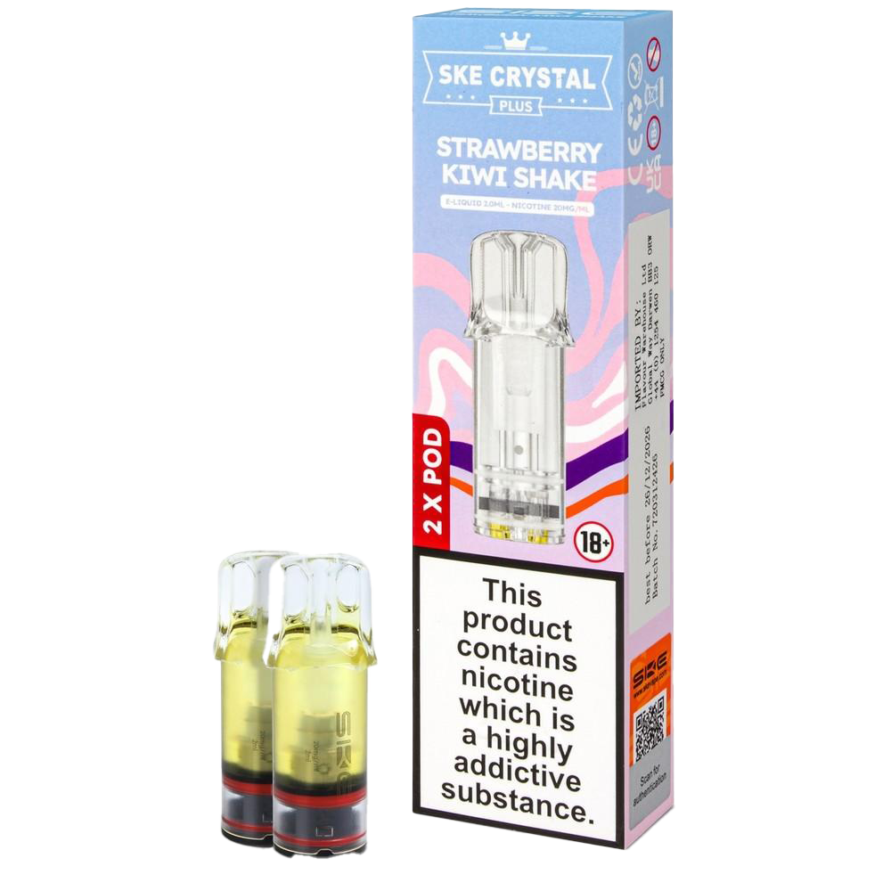 The SKE Crystal Plus Strawberry Kiwi Shake pods add a creamy element to the fruit duo, creating a milkshake-inspired vape. Compatible with Crystal Plus and 600 Pro devices, these 2ml prefilled pods use 20mg nic salt and a 1.1Ω mesh coil to deliver fruit-cream complexity. The 'shake' aspect adds richness that standard fruit pods lack; strawberry provides sweetness, kiwi adds tartness, cream rounds it out. Light cooling keeps it feeling fresh rather than heavy. Around 600 puffs of dessert-fruit hybrid.